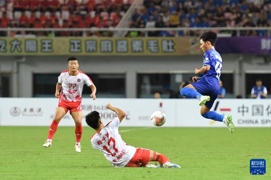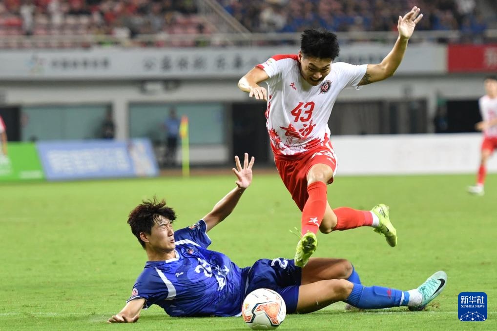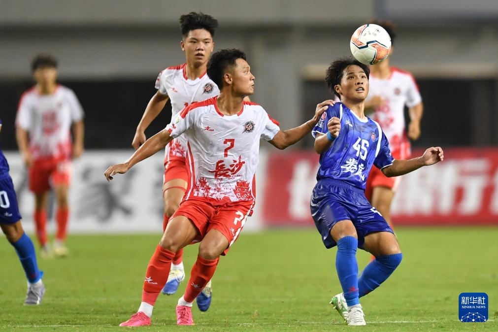 9月7日,娄底队球员吴晓巍(前右)与长沙队球员刘沛林(前左)在揭幕战中拼抢。