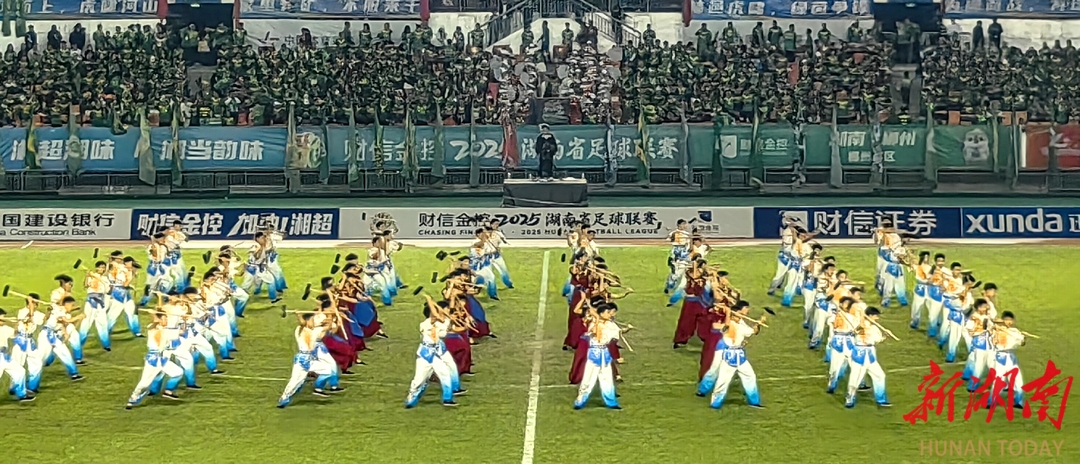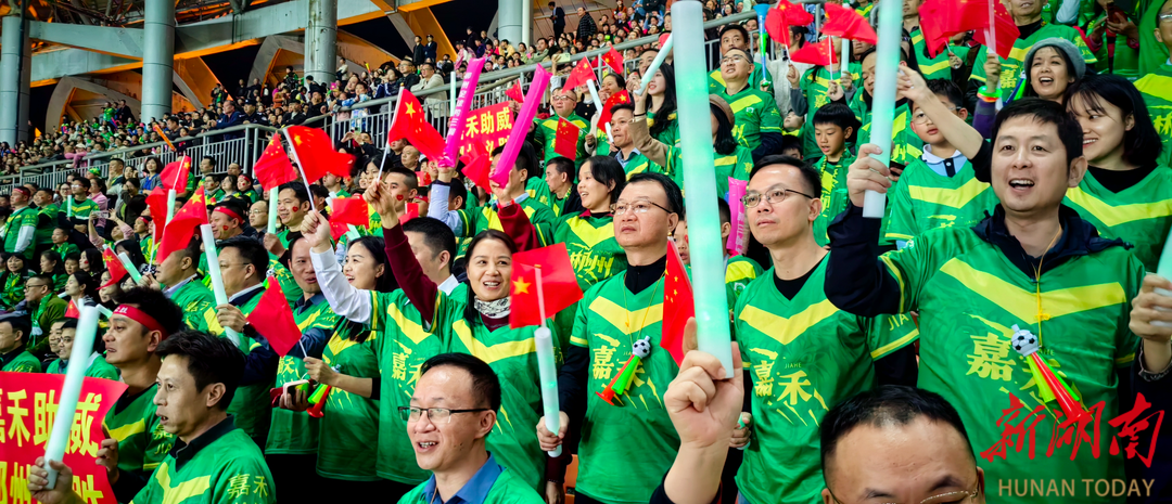 比赛现场,来自嘉禾县的400余名“文体援军”携工业特色与非遗惊艳亮相,通过震撼的巡游方阵、热血的非遗演出和整齐划一的助威声浪,为郴州队筑起坚实的“主场后盾”,让赛场洋溢着浓郁的嘉禾风情与体育激情。