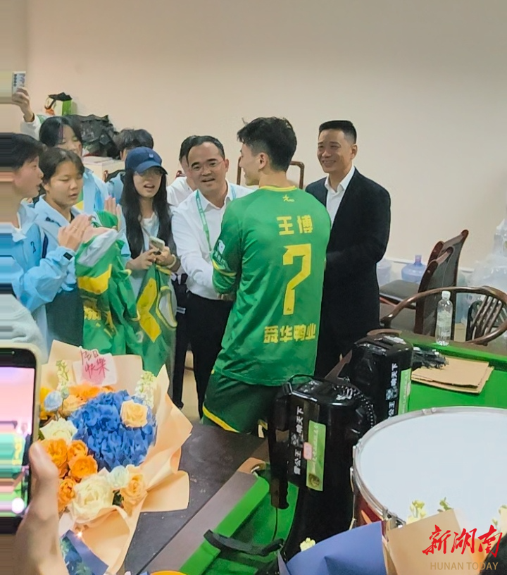 “王博,你是我们嘉禾的骄傲,我们祝你生日快乐。”当天恰好是郴州球队队员王博的生日,比赛结束后,嘉禾一中的女足和部分球迷为王博送上鲜花,在祝他生日快乐的同时,也祝愿王博以后越来越好。