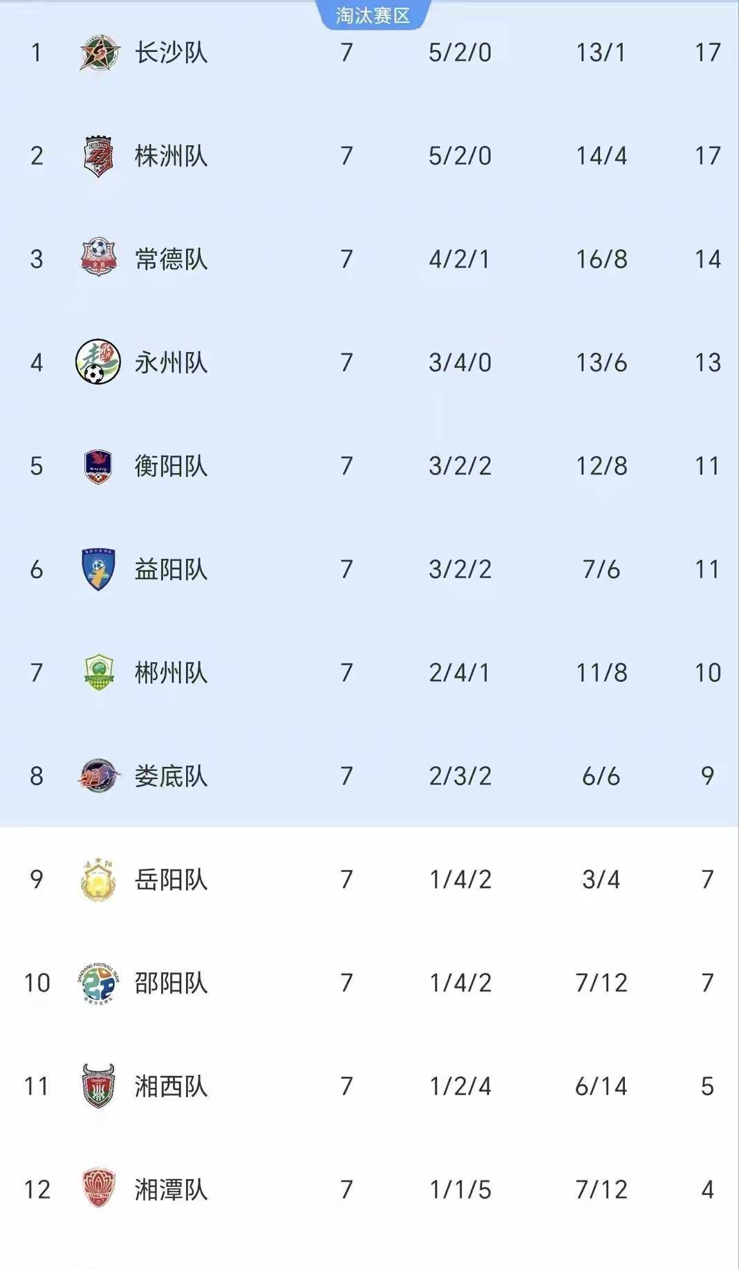 永州队主场逼平实力强劲的长沙队,收获宝贵一分,以13分稳坐第四。而怀化队在本轮0-3负于湘潭队后,仅积1分,不幸垫底。