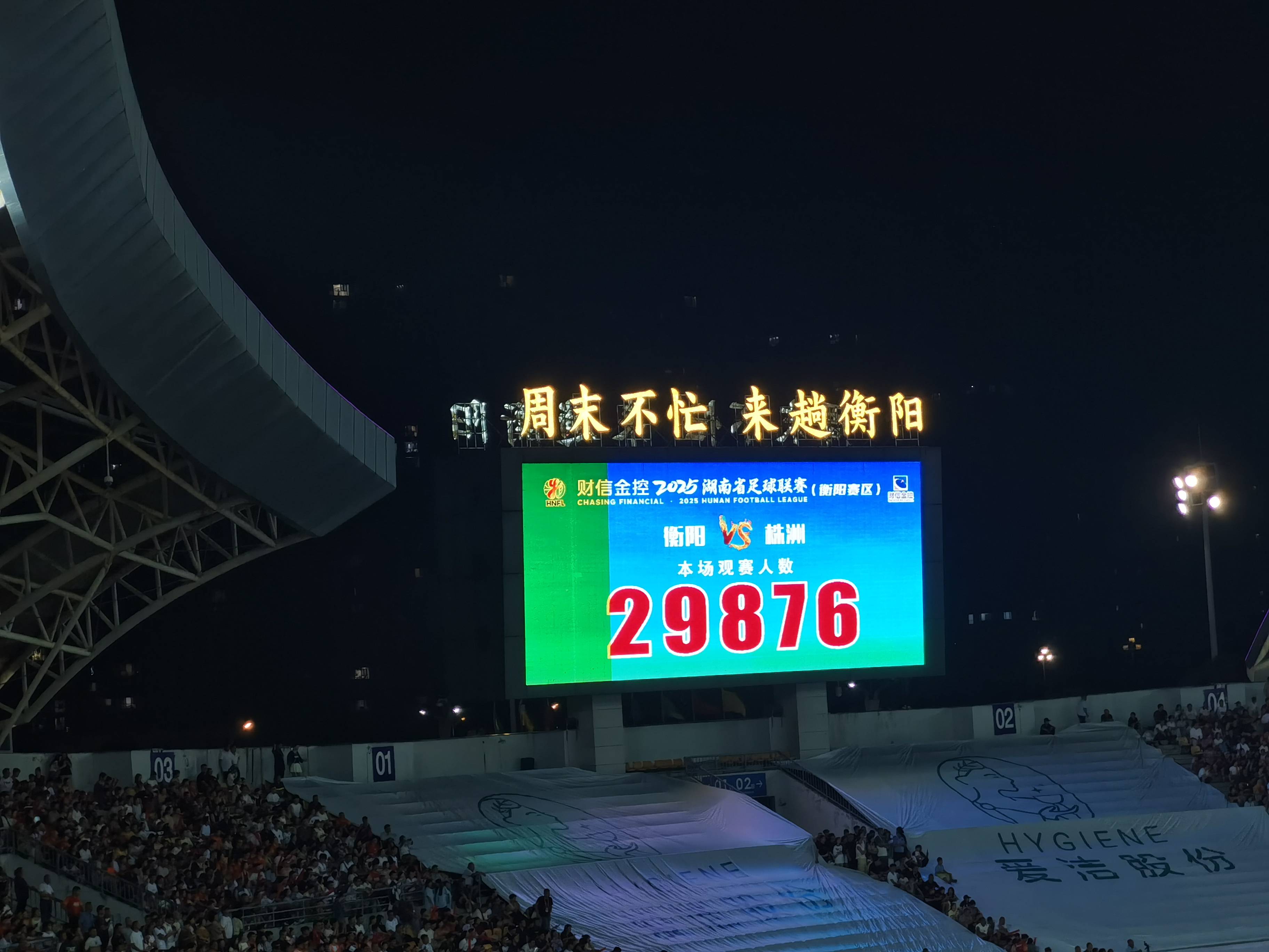 9月7日,湘超联赛在长沙贺龙体育中心盛大开幕。令人惊叹的是,定价仅9.9元的门票瞬间售罄,能容纳3万余人的体育场座无虚席。更令人振奋的是,9月13日衡阳队的首个主场比赛,一座地级市的体育场竟然涌入了29876名观众,连过道都站满了热情的球迷。这是衡阳建市以来规模最大的公众活动,现场气氛之热烈远超预期。