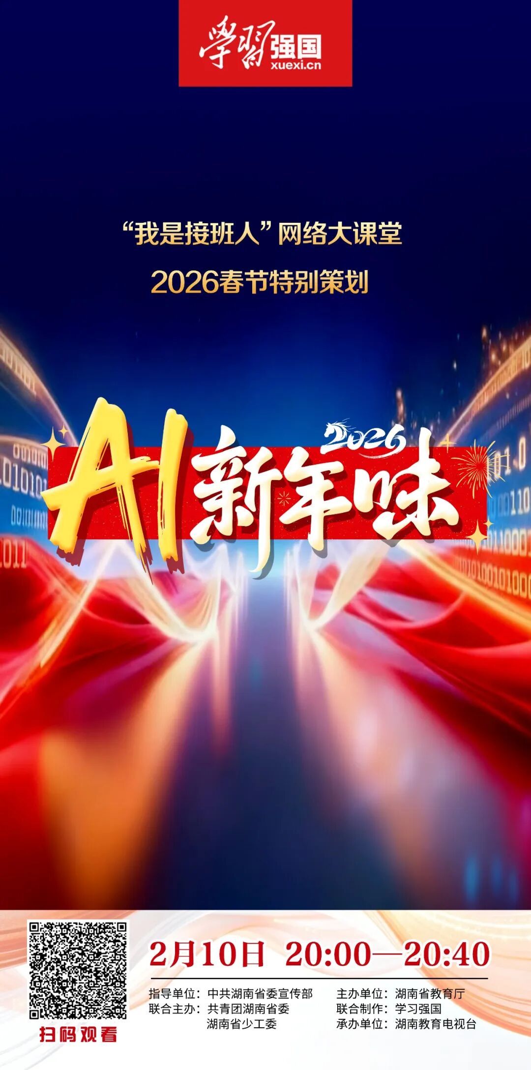 马蹄声疾,春意正浓;薪火相传,智启新程。2月10日20:00—20:40,“我是接班人”网络大课堂《AI新年味》将在“学习强国”学习平台“推荐”频道同步播出,让我们与AI共赴一场传统与科技的盛宴。