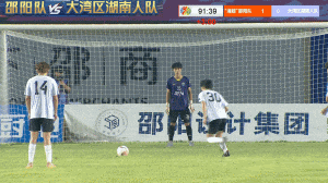 比赛第28分钟,邵阳队开出角球,皮球被大湾区湖南人队14号魏禹国顶到后点,邵阳队13号肖光鑫头球摆渡到门前,2号彭默轩停球凌空抽射破门,邵阳队1比0领先大湾区湖南人队。