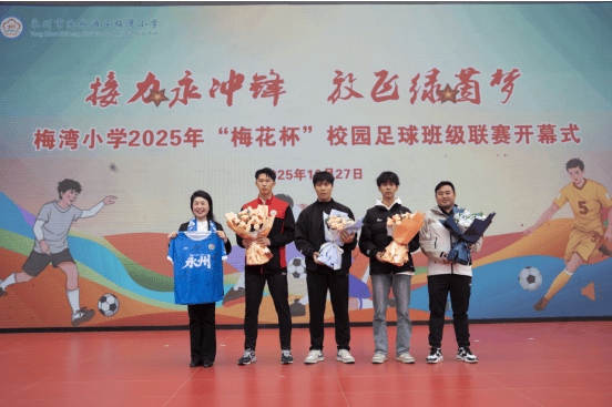 接着,学校“梅花杯”足球联赛的队员代表向4名湘超永州队代表献花,致敬榜样力量。收到这份暖心祝福后,湘超队代表随即回赠惊喜——代表湘超永州队全体成员,向学校送上一件所有教练和队员亲笔签名的珍贵球衣,将湘超健儿的荣耀和“永冲锋”精神传递到梅湾小学。之后,裁判员代表宣誓将公正执裁,运动员代表表态将以“永冲锋”精神参赛,赛出水平、赛出风采。 最后,熊利书记宣布联赛开幕,全场掌声雷动。据悉,本次联赛吸引了多个班级代表队踊跃参赛。赛事不仅为同学们搭建了切磋球技、展现风采的平台,更将推动校园足球运动迈上新高度,让绿茵激情在这所湖南足球特色学校蔚然成风,把“永冲锋”的拼搏精神深植每一位梅香少年心中。返回搜狐,查看更多