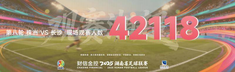 “湘超”前八轮共56场比赛,现场观赛人数总计116.375万人,联赛通过多平台参与赛事宣推,各大社交媒体平台热门线亿次,通过构筑立体化、全方位的传播生态,“湘超”联赛迅速火爆全网。联赛第八轮株洲队与长沙队的焦点之战,现场观赛人数达到42118人,创下了湘超联赛单场观赛人数的最高纪录,火爆的现场氛围充分印证了湖南球迷的巨大热情与足球运动的深厚群众基础。