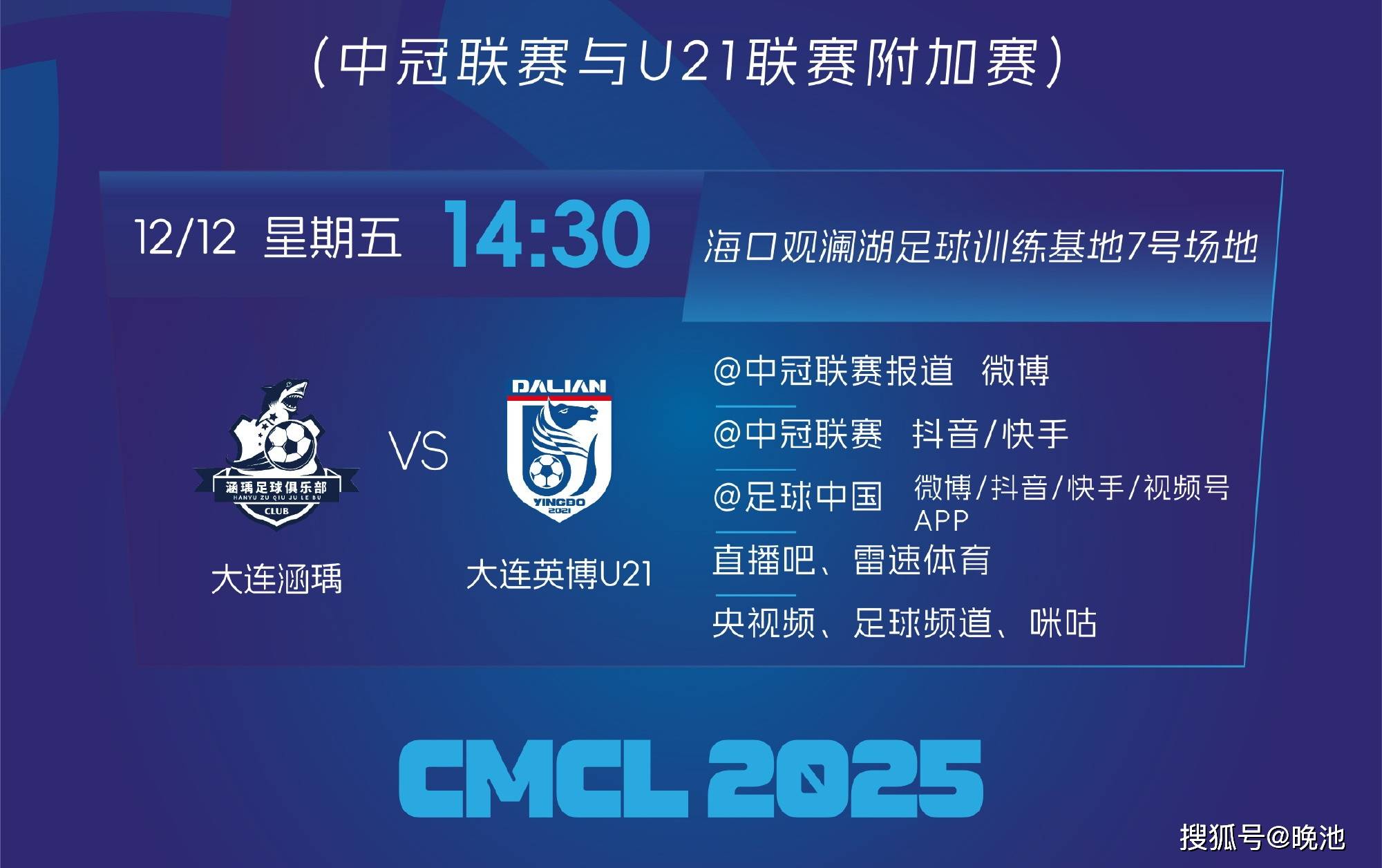 北京时间12月12日(今日)下午14时30分,2025年中冠联赛与U21联赛附加赛(冲乙附加赛)在海口观澜湖国际足球训练基地7号场上演,U21联赛冠军大连英博U21梯队死磕中冠联赛第四名大连涵瑀,上演大连同城德比。