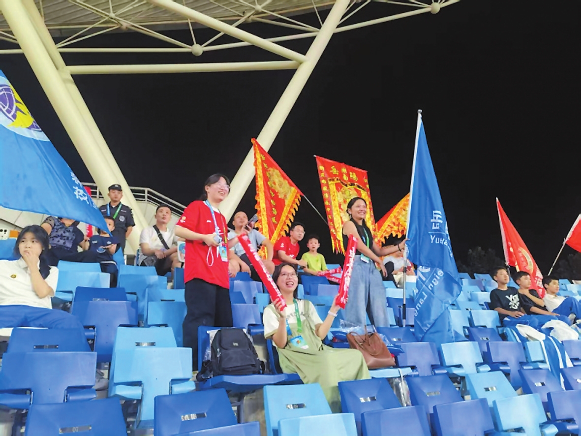 学校不仅派出学生球员和表演队伍,还组织了师生助威团前往现场摇旗呐喊。看台上的一片蓝白色海洋,成为岳阳队坚强的后援。
