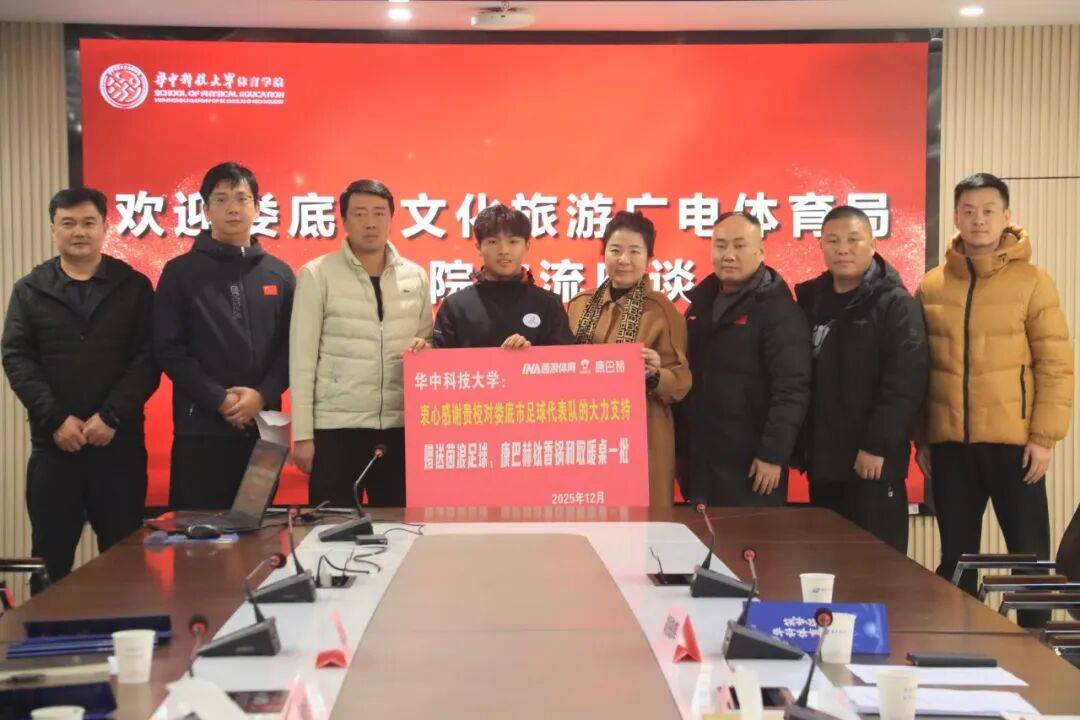会议期间,娄底市文旅广体局还向华中科技大学体育学院递送了感谢信,并赠送了茵浪足球、康巴赫钛香锅和取暖桌等一批物资。感谢信中,娄底市文旅广体局代表湖南省足球联赛娄底赛区组委会,对华中科技大学在2025年湖南省足球超级联赛中给予娄底队的大力支持表示衷心感谢。信中特别提到,华中科技大学学生吴晓巍在担任娄底队场上队长期间,以其先进的战术理念、扎实的技术功底、坚韧的比赛作风和出色的领导能力,成为球队中不可或缺的核心力量与精神领袖,为娄底队取得第五名的成绩立下了汗马功劳。娄底市文旅广体局希望未来双方能够继续深化合作,共同谱写足球事业高质量发展的新篇章。