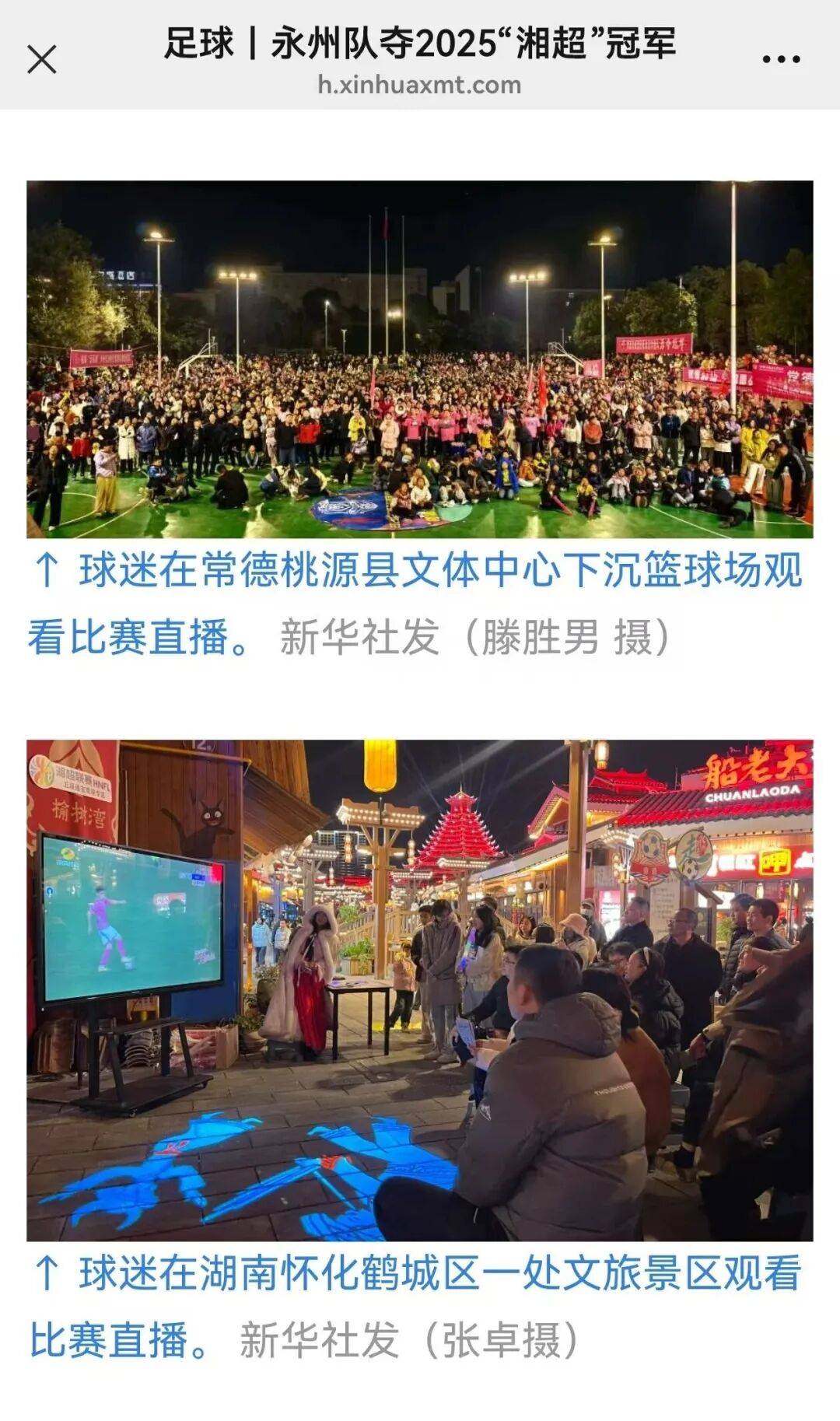 其中,怀化榆树湾第二现场共享足球狂欢登上新华社报道《足球|永州队夺2025“湘超”冠军》,是该组报道中常德永州之外唯一的分会场。