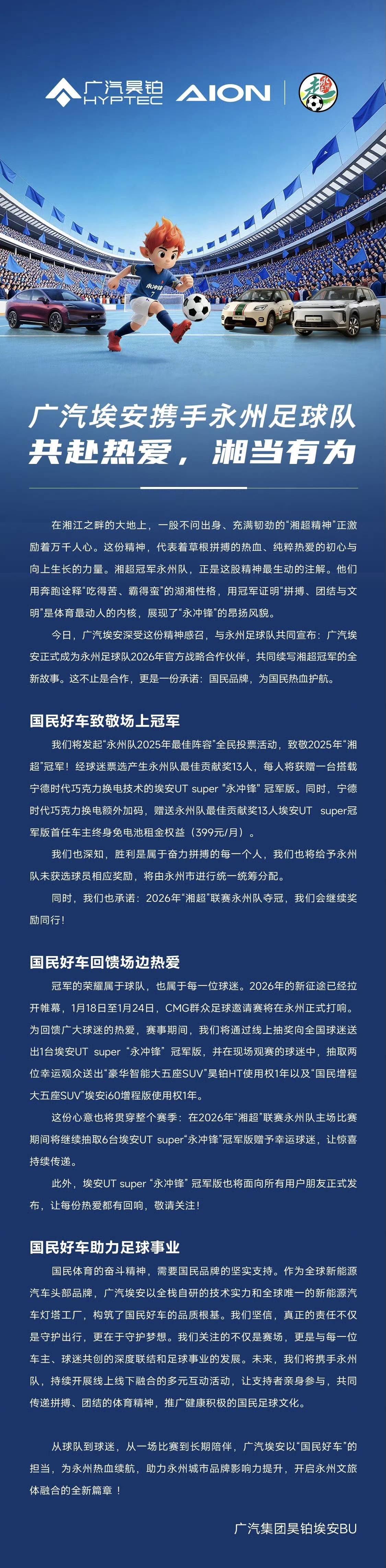 同时,在1月18日至24日于永州举办的CMG群众足球邀请赛期间,广汽埃安将通过线台埃安UT super“永冲锋”冠军版;并在现场观赛的球迷中,抽取两位幸运观众送出“豪华智能大五座SUV”昊铂HT使用权1年,以及“国民增程大五座SUV”埃安i60增程版使用权1年。更让人期待的是,在2026年“湘超”联赛永州队主场比赛期间,广汽埃安将继续抽取6台埃安UT super赠予幸运球迷。这一系列动作,形成了贯穿赛季的品牌互动体系。