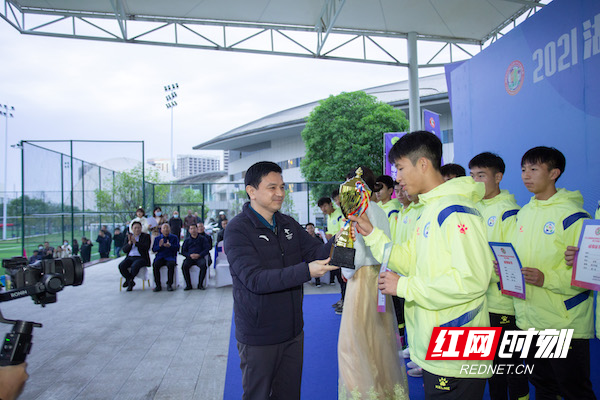 湖南省体育局党组副书记、副局长,省足球协会主席熊倪(左)为获奖队伍颁奖。