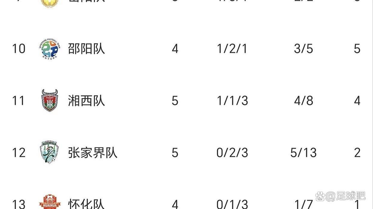 财信金控2025湖南省足球联赛(湘超)第五轮于10月11日同时进行四场比赛。 截至本轮结束,联赛积分榜呈现清晰格局,常德队和长沙队同积13分领跑,常德队凭借9个净胜球的优势排名第一。 株洲队以10分位居第三,郴州队积8分紧随其后。 积分榜中游集团竞争激烈,衡阳队、益阳队和娄底队同积7分,永州队和岳阳队同积6分,邵阳队积5分。 榜尾方面,湘西队积4分,张家界队积2分,怀化队积1分,湘潭队五战全败积0分排名垫底。 本轮比赛结束后,联赛赛程过半,各队积分差距逐渐拉开。